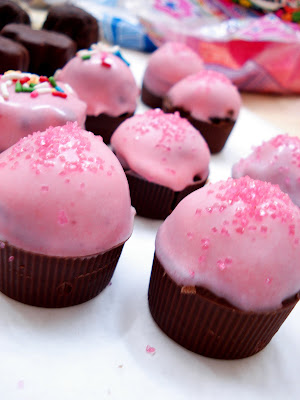 Asse qualquer bolo de caixinha (eu fui de chocolate). Depois que estiver frio esfarele-o em um recipiente e misture um pacote de cream cheese, ele fica uma massinha moldável. Faça bolinhas e leve para gelar. Enquanto isso derreta meia barra de cobertura de chocolate (eu usei ao leite e branco com umas gotas de corante rosa..), depois de uns 10 min da geladeira, mergulhe as bolinhas no chocolate e decore como preferir, leve de novo para gelar por mais uns 10 min e deixe depois fora da geladeira... O cream cheese fica na temperatura ambiente e o recheio fica mmmmuito gostoso,cremoso e molhado.... lembra um brownie..